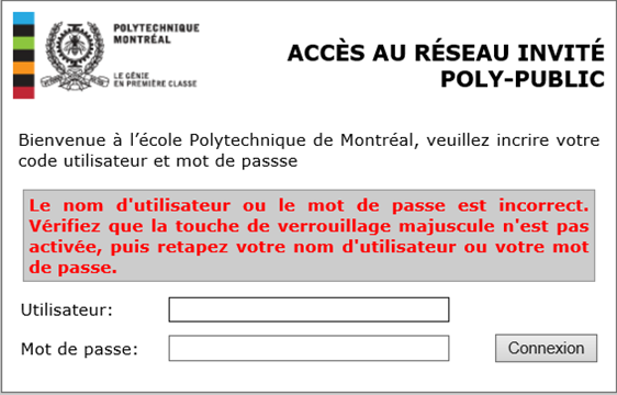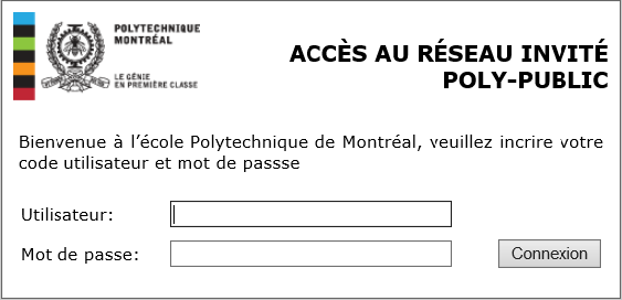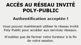L’accès au réseau par une prise verte nécessite une authentification à l’aide d'un code d'identification personnel (CIP) (code étudiant, pMatricule ou uNuméro) et d'un mot de passe. Le trafic réseau des prises vertes est automatiquement redirigé vers un sous-réseau public. Il donne un plein accès à Internet et aux serveurs de type public (ex. : site Web de Polytechnique).