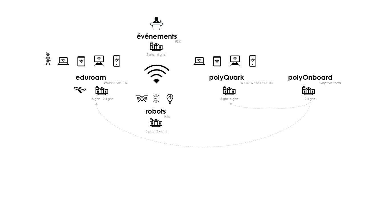 Le réseau sans-fil est disponible en quatre (4) déclinaisons et il dessert tous les pavillons de Polytechnique (Principal, Lassonde, JAB, QM3333, QM3535)